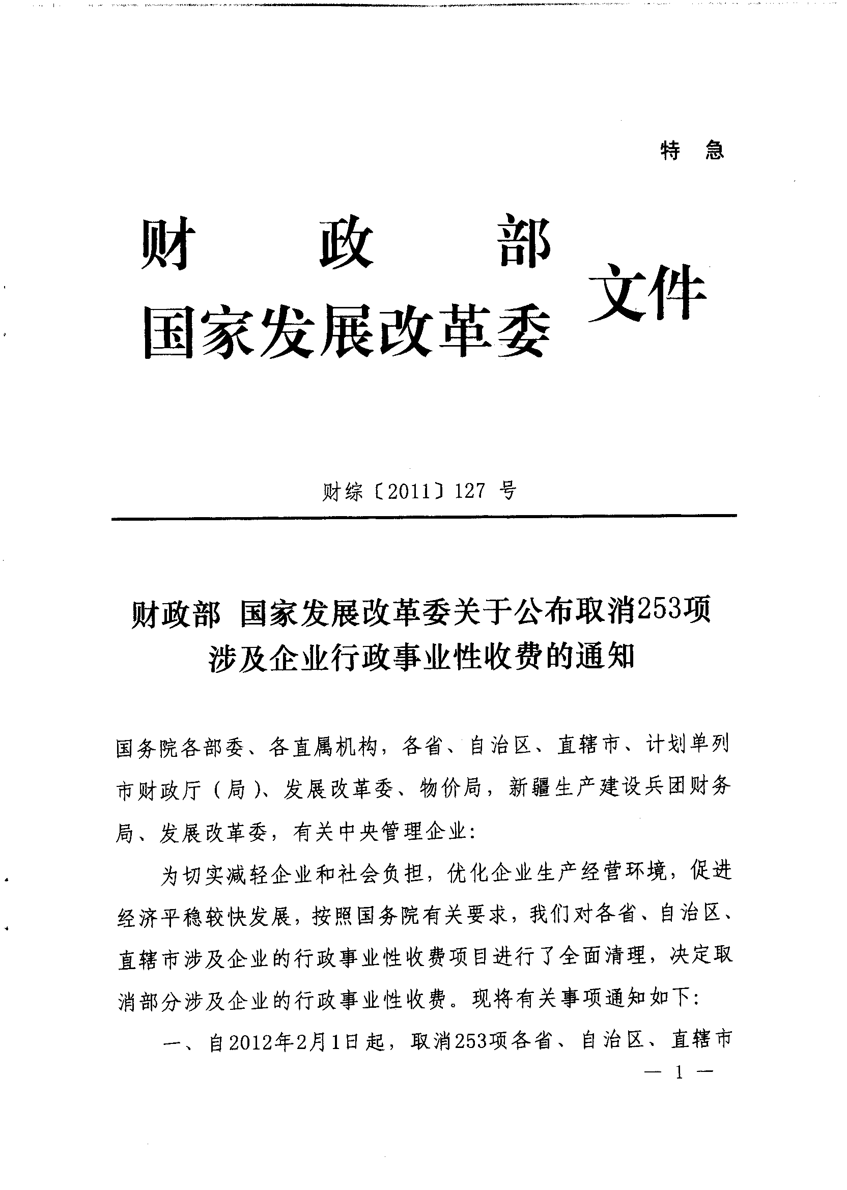 (財(cái)綜〔2011〕127號(hào))財(cái)政部 國家發(fā)展改革委關(guān)于公布取消253項(xiàng)涉及企業(yè)行政事業(yè)性收費(fèi)的通知.png