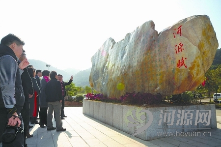 2013年11月28日,《河源賦》大型石刻在萬綠湖廣場(東源新港萬綠湖碼頭)揭幕。該石刻內文為北大教授徐寒所作的《河源賦》,由徐寒本人書寫,石刻材質為黃臘石。此賦約700余字,以富有文采的筆觸,介紹了河源山水人文風情。該石高2.8米,長8米,重達56噸,天然外型酷似魚形,石質堅硬溫潤。城以賦彰,賦以城久,該賦之刻石,為河源美景萬綠湖增添了人文之氣,也提升了河源的知名度和美譽度。