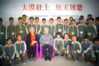 ■張其彬及夫人田紹華與觀展學生合影。2014年11月3日,由市政協主辦的《大漠壯士 航天翹楚——河源籍中國導彈專家、衛星發射專家張其彬歷史圖片展》在市文化館揭展。