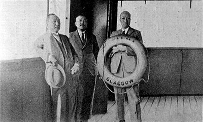 ■1924年11月28日,黃強(持救生圈者)在“大馬”(GLAEGOW)號甲板上。相片原載《臺灣別府鴻雪錄》。
