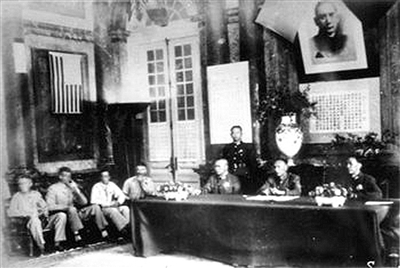 ■1945年9月28日,第一方面軍總司令盧漢將軍(中坐者)在越南河內主持侵越日軍受降儀式。前排右3坐者為黃強。