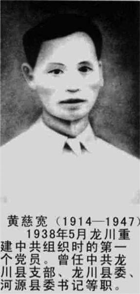 麥文很快向黃慈寬說明,他就是從延安回來的共產(chǎn)黨員。黃慈寬立即興奮地提出要入黨,麥文答應(yīng)做他的入黨介紹人,寫了入黨誓詞,并為他舉行入黨儀式。黃慈寬成為龍川縣黨組織重建后發(fā)展的第一名黨員。龍川黨建新局面就此打開。