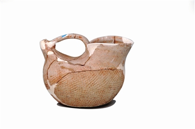 1985年,和平縣彭肖屋山發現了一件雞形壺,高10.3厘米,灰陶,沿上一端流口大,另一端流口小,形近上翹的雞尾,兩個口之間連接橋形提梁把手。除口沿與把外,通身拍印方格紋。次年,在和平大壩子頂山又發現一把流帶把壺,亦通身拍印方格紋。這兩件器物造型獨特,制作精致,底部凹底,制作手法相似,堪稱陶器中的精品。同類型的器物,只在龍川坑子里遺址和粵東的揭陽有發現,是新石器末期粵東與粵東北文化類型中的典型器物,距今約3500年。