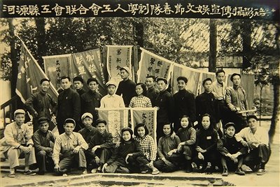 ■1954年3月,河源縣工會(huì)聯(lián)合會(huì)工人粵劇隊(duì)在春節(jié)期間文娛宣傳演出后合影。 資料圖片