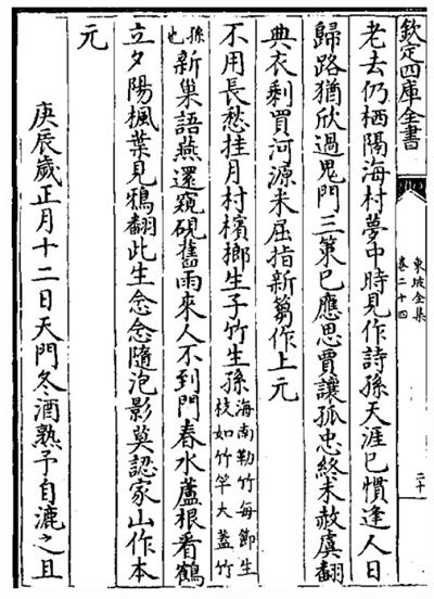 ■欽定四庫全書《東坡全集》卷二十四書影:“典衣剩買河源米,屈指新篘作上元。”