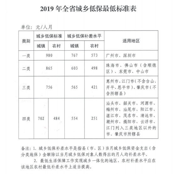 根據《廣東省人民政府辦公廳關于建立全省城鄉低保最低標準制度的通知》(粵府辦〔2013〕17號)和2019年省政府“十件民生實事”部署,日前,經省人民政府同意,省民政廳印發《關于發布2019年全省城鄉低保最低標準的通知》(粵民發〔2019〕46號,以下簡稱《通知》),分四類地區制訂廣東城鄉低保最低標準。與2018年相比,2019年全省城鄉低保最低標準穩步提升,全省城鄉低保標準平均提高了61.25元/人/月、56.25元/人/月;全省城鄉低保補差水平平均提高了40.25元/人/月、28.25元/人/月(詳見附表)。