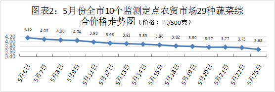 (三)蔬菜:29個品種蔬菜綜合價格3.91元,環(huán)比跌10.53%,月內(nèi)呈持續(xù)下行(圖表2)。其中:27個品種價格下跌,2個品種價格上漲。跌幅較大的品種是:本地菜心3.54元、水空心菜3.39元、苦瓜4.42元、青豆角4.98元、蒜苔7.44元,環(huán)比分別跌21.16%、28.18%、17.07%、26%、13.69%;上漲的品種是:青皮冬瓜2.47元、南瓜2.75元,環(huán)比分別漲0.41%和0.73%。