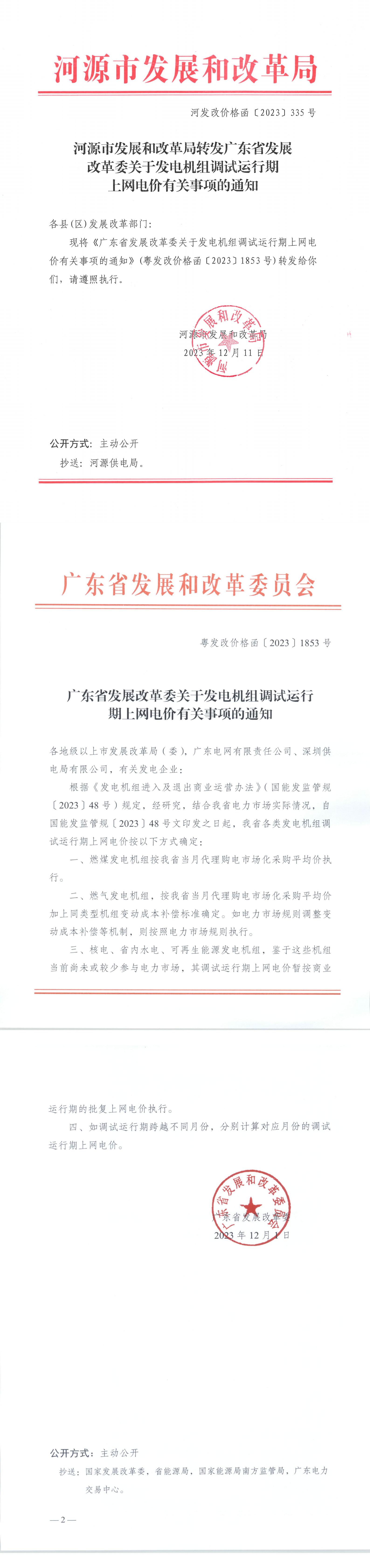 河源市發展和改革局轉發關于廣東省發展改革委關于發電機組調試運行期上網電價有關事項的通知