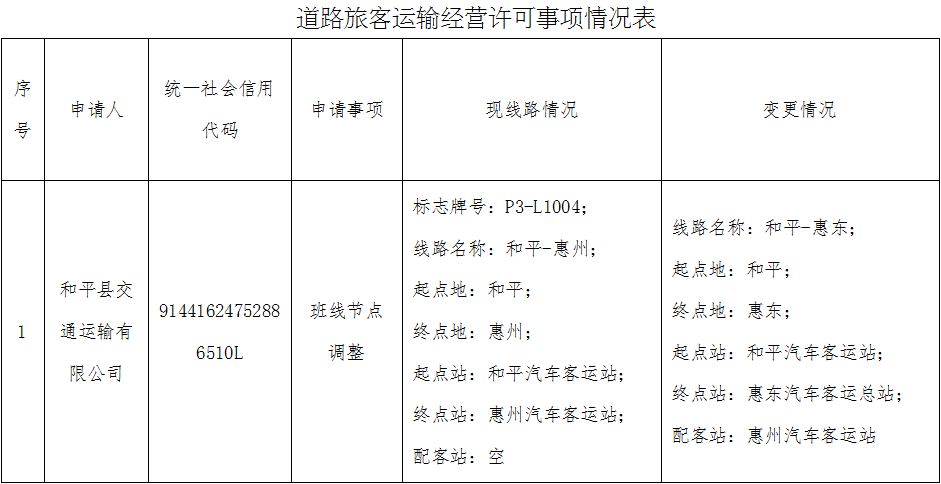 和平縣交通運輸有限公司提出的道路旅客運輸經營許可申請已經我局受理,根據《道路旅客運輸及客運站場管理規定》、《廣東省交通運輸廳實施〈道路旅客運輸及客運站管理規定〉辦法》等法律法規規定,現將許可事項予以公示(見附表),公開征求社會各界的意見,如對公示的許可事項有意見,請以書面形式向我局反映。個人反映意見須署名并附聯系電話,單位反映意見須加蓋單位公章。公示有效期為10個工作日,自公示之日起計算。