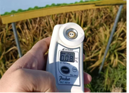 專家組按照水稻品種實收測產(chǎn)要求,在對百畝示范方進(jìn)行整體考察的基礎(chǔ)上,隨機(jī)抽取3塊田,采用收割機(jī)進(jìn)行收割脫粒,當(dāng)場裝袋稱重計產(chǎn)、丈量面積,稱重后每塊田稱取3公斤鮮稻谷樣本測定雜質(zhì)率和水分含量,最終計算出稻谷實際產(chǎn)量。根據(jù)取樣3塊田實收測產(chǎn)結(jié)果,100畝示范方折合標(biāo)準(zhǔn)產(chǎn)量為平均畝產(chǎn)501.98 公斤干谷。與此同時,專家組對示范種植田塊進(jìn)行了pH值檢測及含鹽量測定。經(jīng)過多輪多點(diǎn)采樣,最終得出種植田塊 pH 平均值為 9.2,平均含鹽量為 0.8%,具有較高的鹽堿脅迫度。