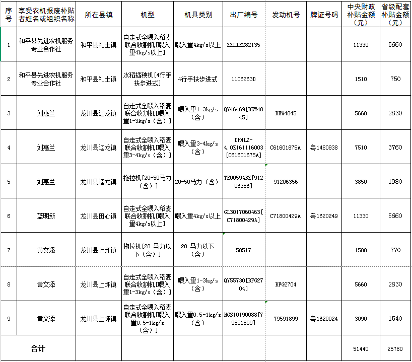 經(jīng)審核,同意下列農(nóng)機報廢補貼申請者享受補貼,現(xiàn)予公示,公示時間自2025年9月15日開始至2025年9月19日止,對下列申請者獲得補貼有異議者,請書面或電話向河源市農(nóng)業(yè)農(nóng)村局反映。聯(lián)系部門:河源市農(nóng)業(yè)農(nóng)村局農(nóng)業(yè)機械化管理科,聯(lián)系地址:河源市穗香街13號,郵政編碼:517000,聯(lián)系電話:3361721,聯(lián)系人:李健溥。