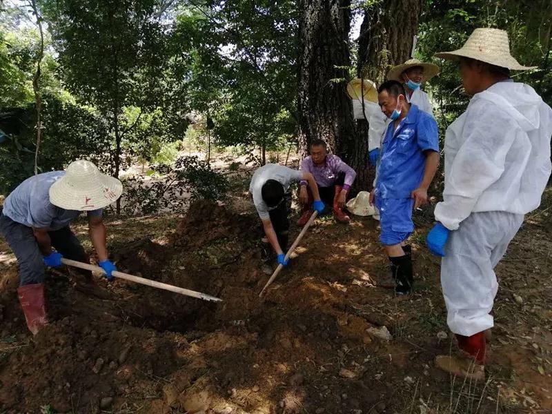 6月22日,接群眾舉報,內莞鎮小洞未開發的暗巖處發現有洪水后停滯在巖內的死亡豬十四頭,死亡禽百余只。當時洞內臭味嚴重,且是莞村新建自然村的飲水源,連平縣農業農村部門立即組織力量,配備手電、麻袋、鋤頭、鐵鏟、防腐服、口罩等,深入洞內清潔。雖然洞內無路,有些峽縫甚至不到一米寬,任務異常艱巨,但全體農業人不畏艱險,奮戰五小時,終于安全完成大部分清理工作,后天將完成全部清理工作,全力保障群眾的飲水安全。