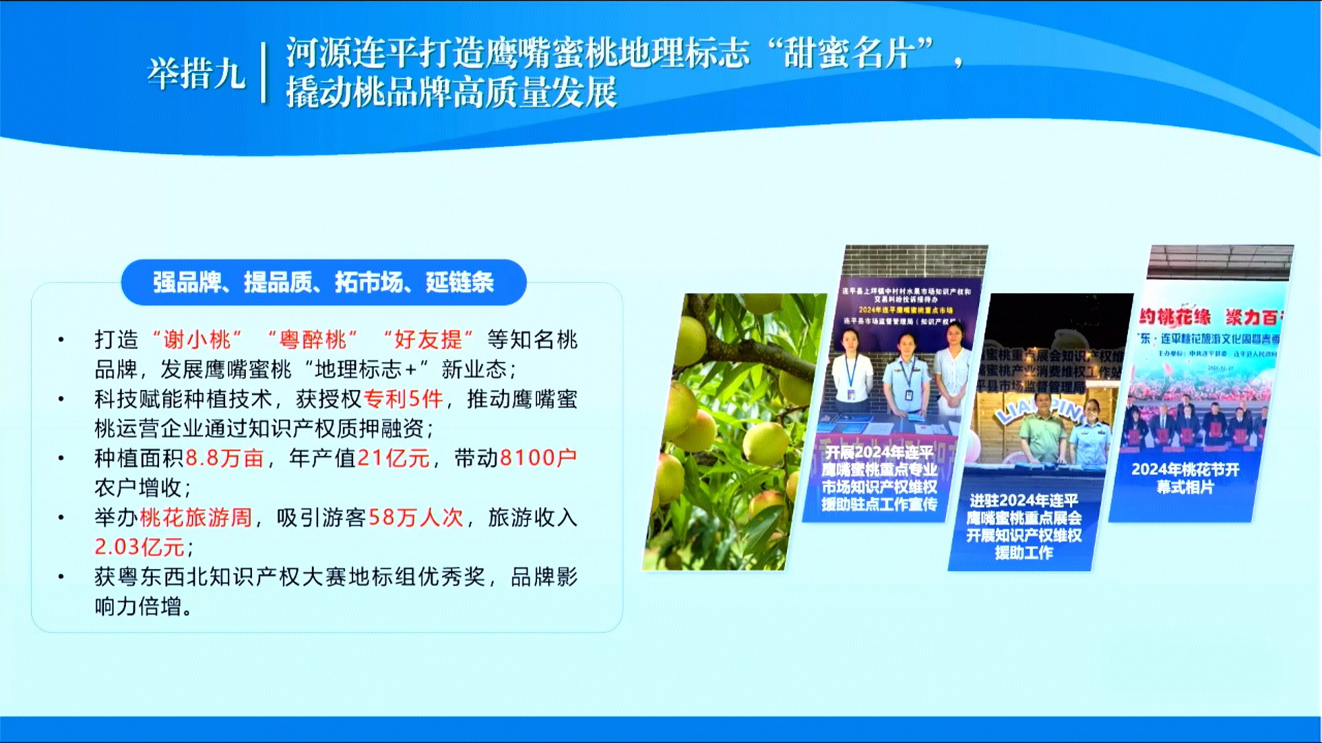 日前,廣東省市場監(jiān)督管理局(知識產(chǎn)權局)召開發(fā)布會,對外發(fā)布2024年度廣東知識產(chǎn)權“十大事件”和15項“基層改革創(chuàng)新舉措”。其中,我市“河源連平打造連平鷹嘴蜜桃地理標志‘甜蜜名片’,撬動桃品牌高質量發(fā)展”經(jīng)過初步篩選、網(wǎng)絡投票、專家評審等環(huán)節(jié),成功入選2024年度廣東知識產(chǎn)權“基層改革創(chuàng)新舉措”。