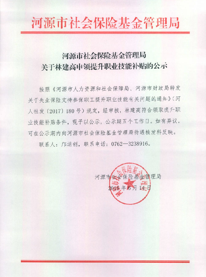 按照《河源市人力資源和社會保障局、河源市財政局轉發關于失業保險支持參保職工提升職業技能有關問題的通知》(河人社發(2017)180號)規定,經審核,林建高符合領取提升職業技能補貼條件,現予以公示,公示期五個工作日。如有異議,可在公示期內向河源市社會保險基金管理局待遇核發科反映。