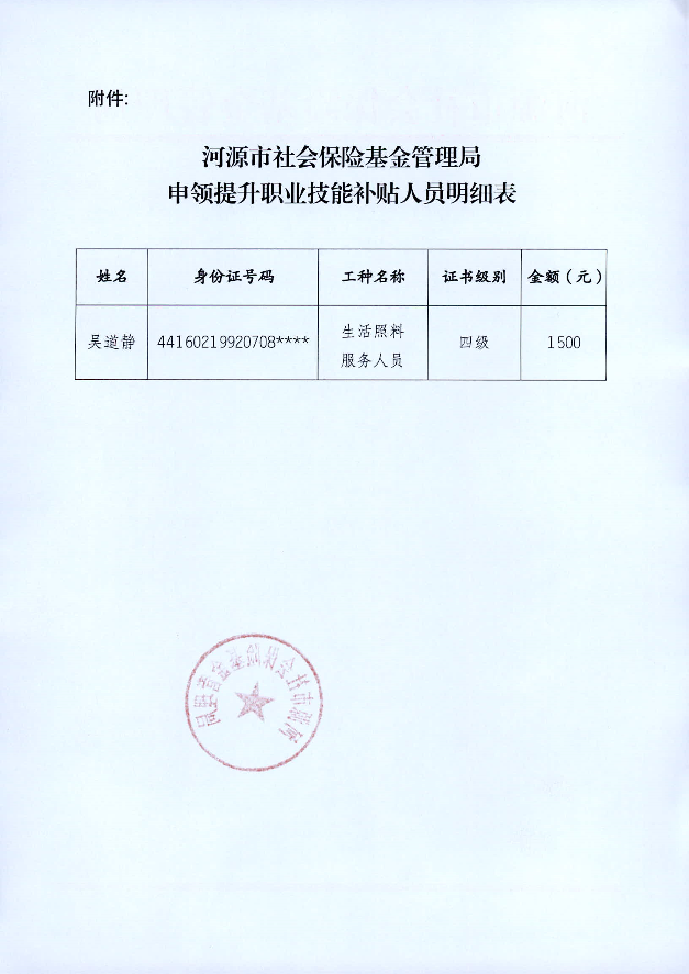 河源市社會保險基金管理局關(guān)于吳道靜申領(lǐng)提升職業(yè)技能補(bǔ)貼的公示