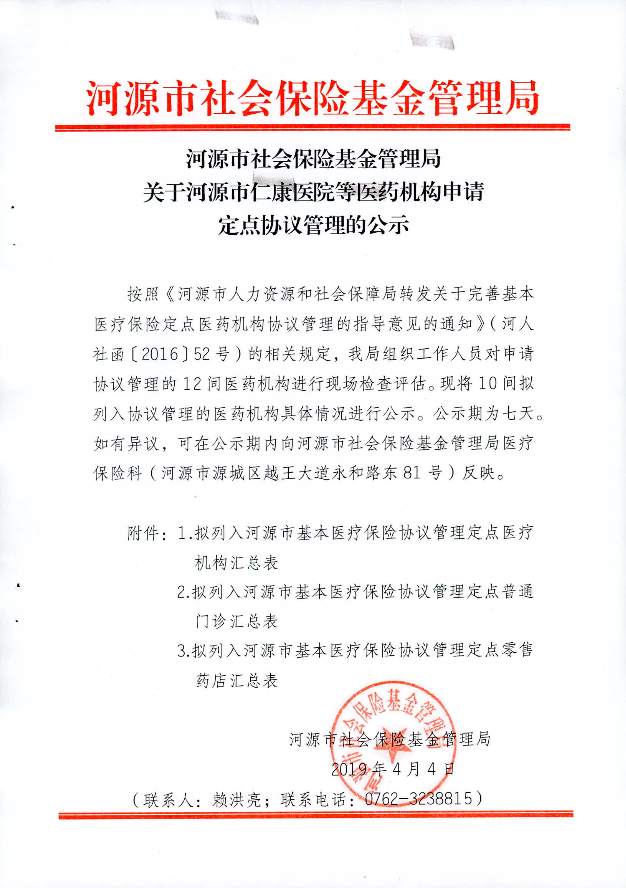 關于河源市仁康醫院等醫藥機構申請定點協議管理的公示