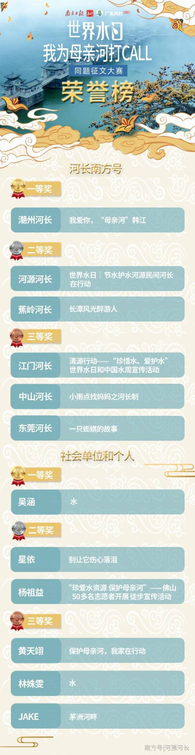 今年3月22日至3月28日,南方日報、南方+客戶端與廣東省河長辦、廣東省水利廳聯(lián)合主辦“世界水日,我為母親河打CALL”同題征文大賽,面向全廣東用戶發(fā)起投稿邀請,鼓勵廣大用戶分享自己“珍愛水資源,保護母親河”的故事,弘揚“親水、愛水、護水”的生活理念,共建共享美麗廣東!