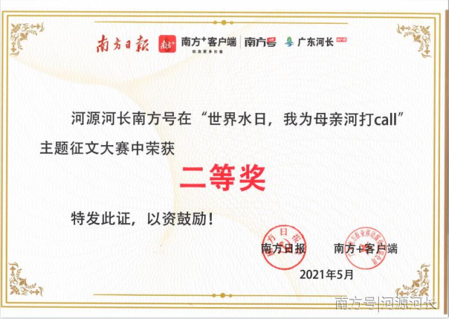 為進一步加強節(jié)水、護河宣傳,市河長辦積極組織發(fā)動各縣區(qū)河長辦參加了征文大賽,其中河源河長南方號推送的作品《節(jié)水護水河源民間河長在行動》獲得了“廣東河長南方號”組第二名。