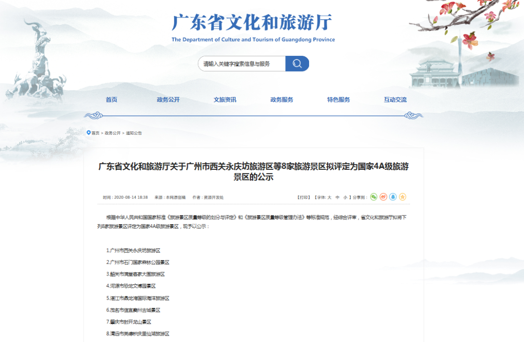 經(jīng)綜合評審,省文化和旅游廳擬將廣州市西關(guān)永慶坊旅游區(qū)、廣州市石門國家森林公園景區(qū)、韶關(guān)市滿堂客家大圍旅游區(qū)、河源市恐龍文博園景區(qū)、湛江市鼎龍灣國際海洋旅游區(qū)、茂名市信宜竇州古城景區(qū)、肇慶市封開龍山景區(qū)、清遠(yuǎn)市英德積慶里仙湖旅游區(qū)8家旅游景區(qū)評定為國家4A級旅游景區(qū)。