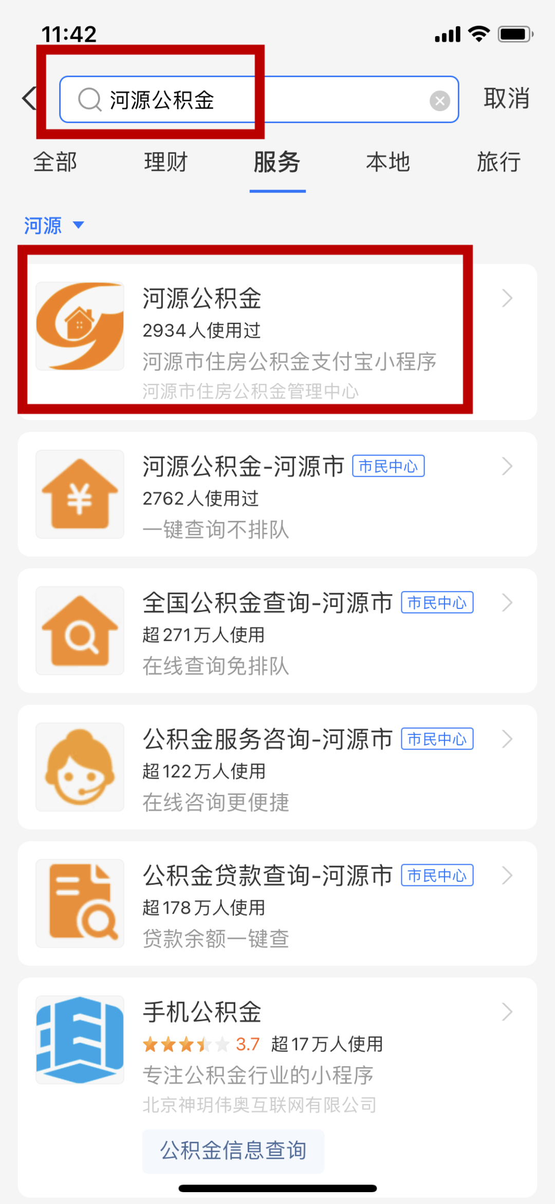 打開“支付寶”App,搜索“河源公積金”,點擊“服務”,找到“河源公積金”官方小程序,點擊進入,按步驟進行刷臉認證,即可直接查看。