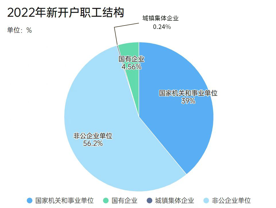 2022年,新開戶單位446家,凈增單位247家,新開戶職工2.62萬人,凈增職工0.85萬人。2022年全市新開戶職工中,按單位性質分類,非公企業單位職工占56.2%。