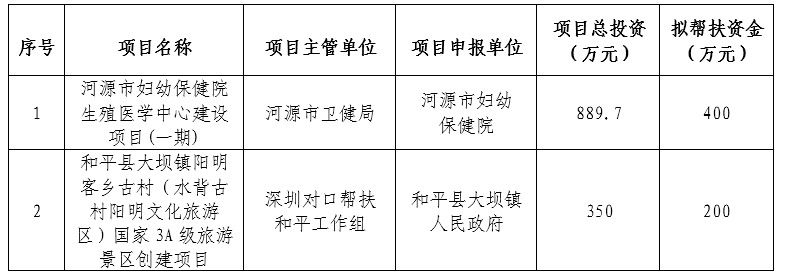 為做好深圳對口幫扶協作河源工作,不斷推進社會民生和鄉村振興幫扶工作的高質量發展,經研究,深圳對口幫扶協作河源指揮部擬將“河源市婦幼保健院生殖醫學中心建設項目(一期)”“和平縣大壩鎮陽明客鄉古村(水背古村陽明文化旅游區)國家3A級旅游景區創建項目”等2個項目列入深圳對口幫扶協作河源2023年度專項資金幫扶計劃(詳見附件)。根據有關規定,現予以公示,自2024年1月4日至2024年1月10日止。