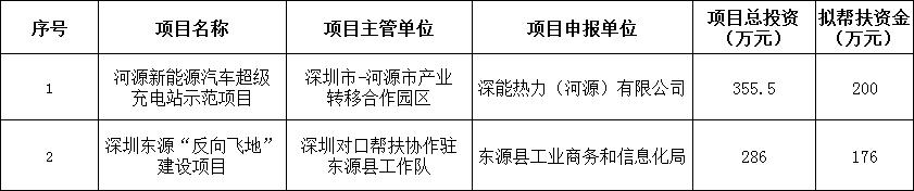 為做好深圳對口幫扶協(xié)作河源工作,不斷推進產(chǎn)業(yè)協(xié)作的高質(zhì)量發(fā)展,經(jīng)研究,深圳對口幫扶協(xié)作河源指揮部擬將“河源新能源汽車超級充電站示范項目”和“深圳東源‘反向飛地’建設(shè)項目”等兩個項目列入深圳對口幫扶協(xié)作河源2023年度專項資金幫扶計劃(詳見附件)。根據(jù)有關(guān)規(guī)定,現(xiàn)予以公示,公示期自2024年6月5日至2024年6月12日止。