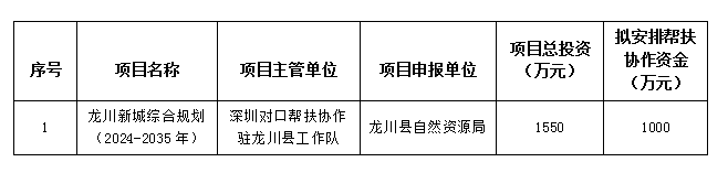 2023年度幫扶協作資金項目計劃【龍川新城綜合規劃(2024-2035年)項目】情況一覽表