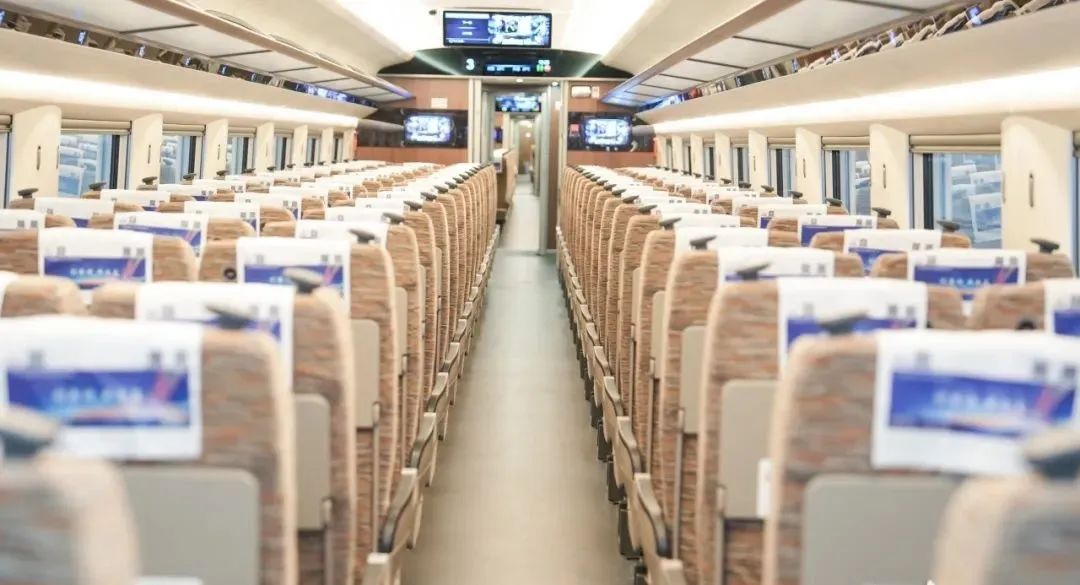 本次試運行車次采用復興號智能動車組列車,車體使用紅色涂裝覆蓋,車外顯示屏信息字體改為藍色LED燈后更加顯眼悅目。一等座車廂采用“2+2”布局,座椅靠背可調節,在扶手和座椅前方均配備小桌板,同時增設大件行李存放區。二等座車廂采用“2+3”布局,每節二等座車廂均設有大件行李存放區。