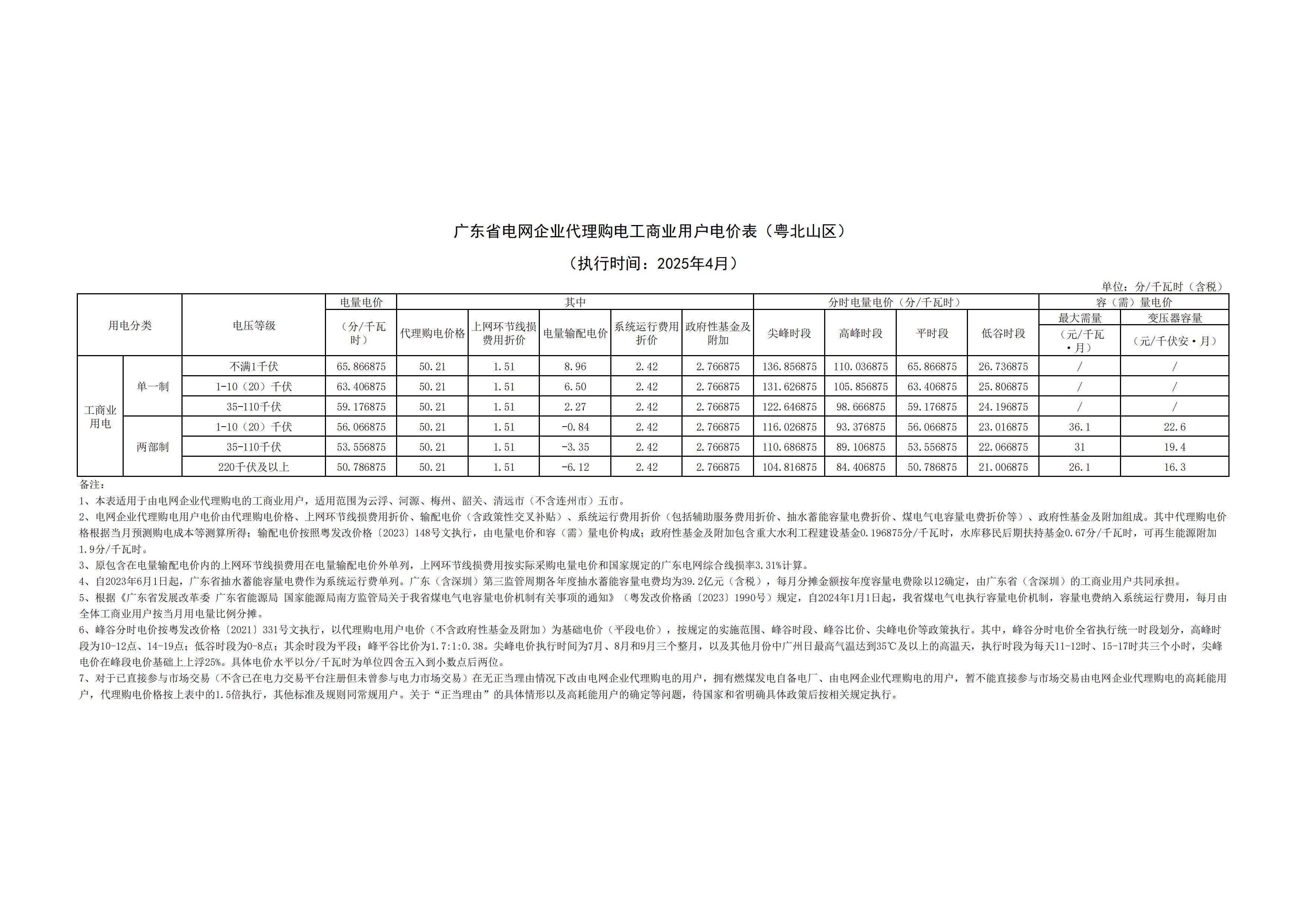 廣東省電網企業代理購電工商業用戶電價表(粵北山區)執行時間:2025年4月