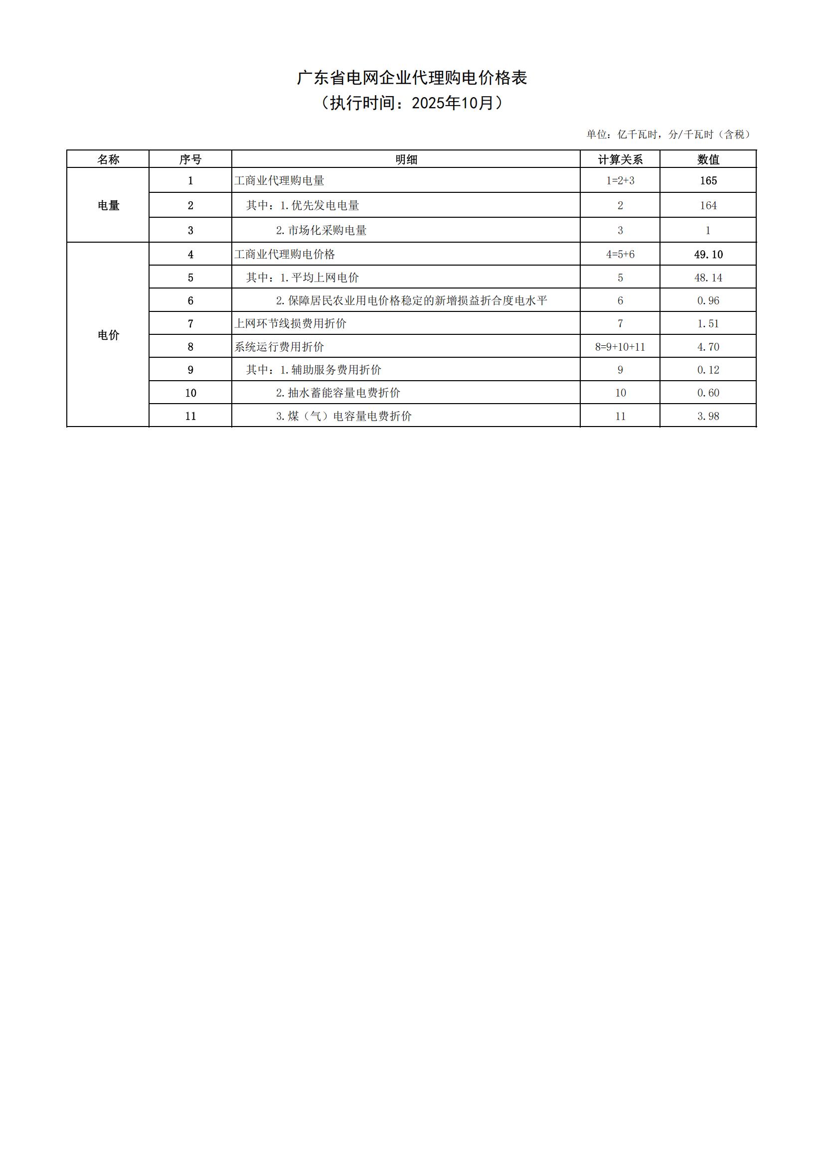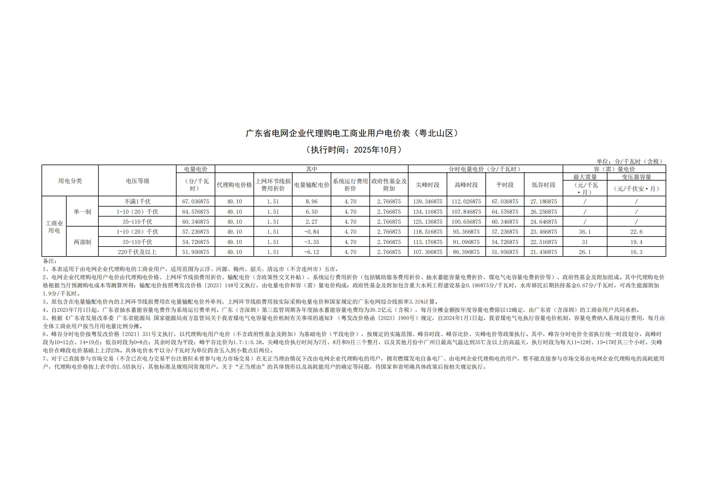 廣東省電網(wǎng)企業(yè)代理購(gòu)電工商業(yè)用戶電價(jià)表(粵北山區(qū))