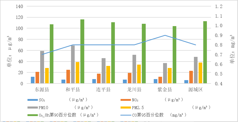 各縣區各項污染物濃度指標均符合《環境空氣質量標準》(GB3095-2012)年均濃度二級標準限值要求,按照環境空氣質量綜合指數排名,第一名為紫金縣,第二名為連平縣,第三名為龍川縣(詳見表1、圖1)。