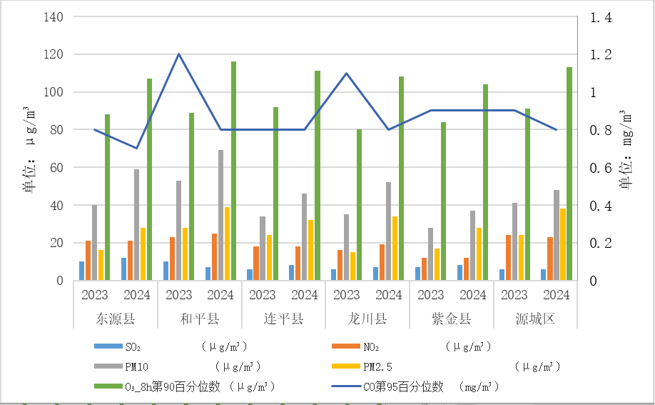 根據國家對河源市環境空氣考核的情況,2024年12月我市環境空氣質量綜合指數為3.42,達標天數31,達標率為100%,其中優的天數為11天,良的天數為20天。空氣首要污染物為PM2.5和O3-8h。我市SO2、NO2、PM10和PM2.5濃度均值分別為6μg/m3、23μg/m3、50μg/m3和39μg/m3,CO日均濃度第95百分位數為0.8mg/m3,O3日最大8小時濃度第90百分位數為115μg/m3,除PM2.5外均符合《環境空氣質量標準》(GB3095-2012)二級標準限值要求。