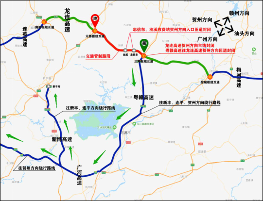 ?。ǘ?1月27日8時至12月11日24時G78龍連高速公路金花隧道賀州方向K283+094-K287+824路段封閉;封閉龍連高速公路往賀州方向三角樞紐互通(K256+729)主線,封閉三角樞紐互通粵贛高速往河源及贛州方向轉龍連高速賀州方向匝道和封閉龍連高速公路忠信東、油溪收費站往賀州方向入口匝道。封閉期間,龍連高速公路往賀州方向車輛從三角樞紐互通出口分流駛出,繞行粵贛高速、廣河高速等。