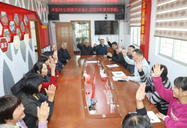 中和村舉行2023年第四季度道德評議會,代表舉手評出優秀榜樣。