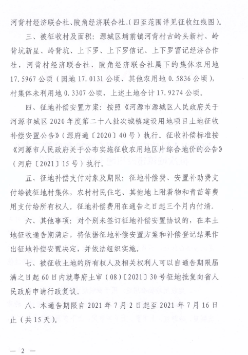 河源市人民政府關(guān)于城區(qū)2020年度第二十八批次城鎮(zhèn)建設(shè)用地土地征收的通告