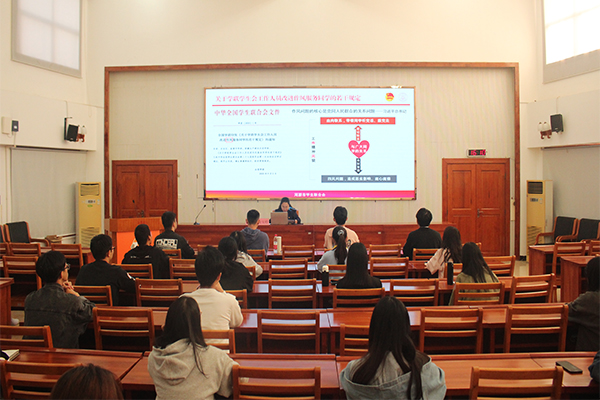 陳曉峰書記以習近平總書記的致信祝賀為學習會拉開序幕,并對全國學聯(lián)二十七大的召開情況做了簡單介紹。接著,圍繞孫春蘭代表黨中央在全國青聯(lián)十三屆全委會和全國學聯(lián)二十七大上的致詞、《中華全國學生聯(lián)合會章程》、在全國學聯(lián)二十七大上的報告、賀軍科在全國學聯(lián)第二十七次代表大會第三次全體會議暨閉幕式上的報告、若干意見、若干規(guī)定等六個方面詳細介紹了學聯(lián)學生會的定位職能、基本任務、深化改革的前進方向及從嚴治會的有關要求。陳曉峰書記表示,改革只有進行時,沒有完成時,學校共青團要與學聯(lián)學生會深化改革有機協(xié)同推進,不忘跟黨初心,牢記職責使命,在實現(xiàn)中華民族偉大復興中國夢的進程中書寫青春篇章。