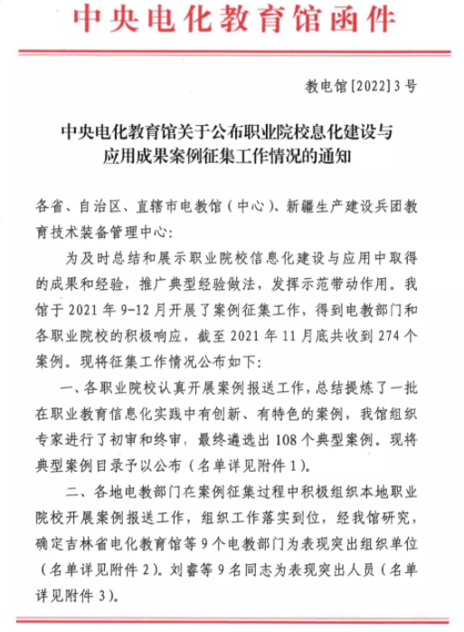 據悉,職業院校信息化建設與應用成果案例,是中央電化教育館面向職業院校征集并擇優遴選的在職業教育信息化實踐中有創新、有特色的典型案例,旨在貫徹落實《國家職業教育改革實施方案》和《職業教育提質培優行動計劃(2020-2023年)》,及時總結和展示職業院校信息化建設與應用中取得的成果和經驗,持續發揮職業院校數字校園建設實驗校在職業教育信息化領域的示范帶動作用。入選的案例將在國家教育資源公共服務平臺宣傳展示,供廣大職業院校參考借鑒。
