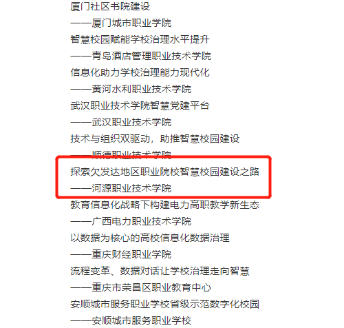 近日,中央電化教育館發布了《中央電化教育館關于公布職業院校信息化建設與應用成果案例征集工作情況的通知》,河源職業技術學院《探索欠發達地區職業院校智慧校園建設之路》成功入選職業院校信息化建設與應用成果案例。