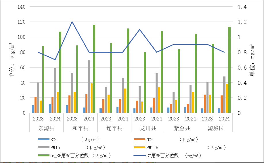 根據(jù)國家對河源市環(huán)境空氣考核的情況,2024年12月我市環(huán)境空氣質(zhì)量綜合指數(shù)為3.42,達(dá)標(biāo)天數(shù)31,達(dá)標(biāo)率為100%,其中優(yōu)的天數(shù)為11天,良的天數(shù)為20天。空氣首要污染物為PM2.5和O3-8h。我市SO2、NO2、PM10和PM2.5濃度均值分別為6μg/m3、23μg/m3、50μg/m3和39μg/m3,CO日均濃度第95百分位數(shù)為0.8mg/m3,O3日最大8小時濃度第90百分位數(shù)為115μg/m3,除PM2.5外均符合《環(huán)境空氣質(zhì)量標(biāo)準(zhǔn)》(GB3095-2012)二級標(biāo)準(zhǔn)限值要求。