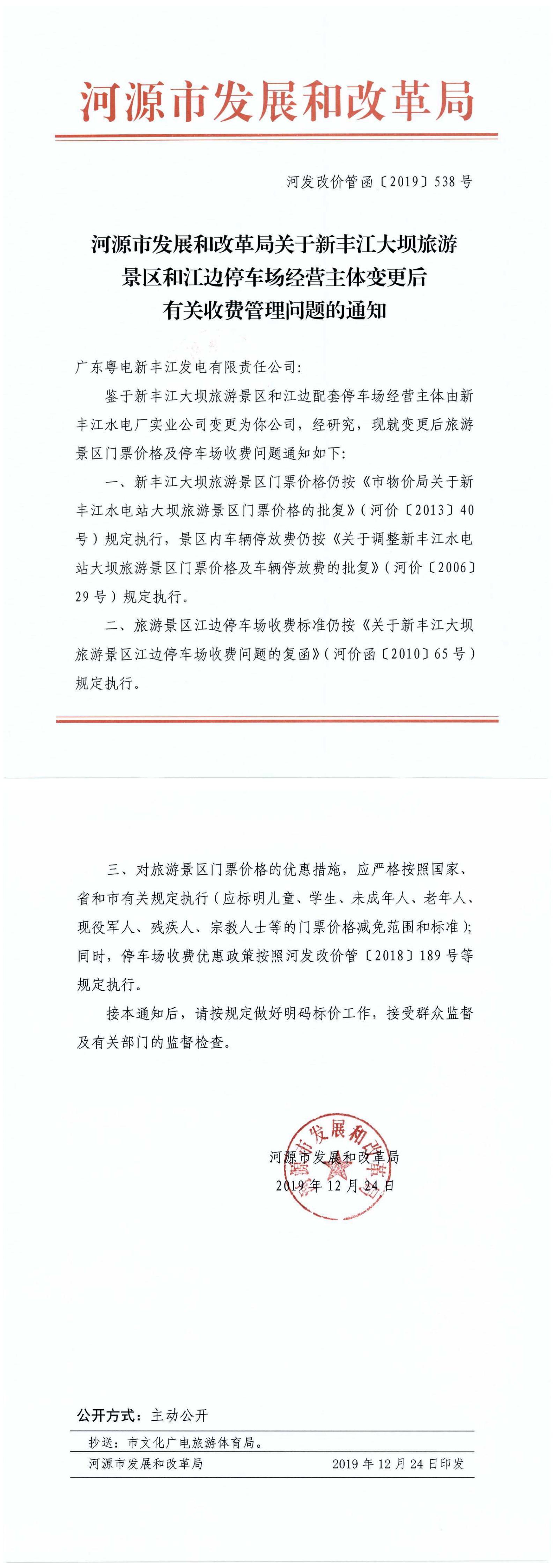 河源市發展和改革局關于新豐江大壩旅游景區河江邊停車場經營主體變更后有關收費管理問題的通知