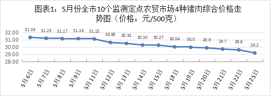 (二)肉禽蛋和水產(chǎn)品:8個品種畜類綜合價格41元,環(huán)比跌3.64%。其中4個豬肉品種綜合價格30.39元,環(huán)比跌6.31%,月內(nèi)呈持續(xù)回落走勢(圖表1)。如:排骨34.72元、精瘦肉32.19元、有皮上肉26.84元、肋條肉27.81元,環(huán)比分別跌6.06%、7.02%、7.32%和4.79%。2個品種禽類綜合價格16.54元,環(huán)比跌3.61%。如:雞肉18.13元、鴨肉14.95元,環(huán)比分別跌2.58%、4.84%。4個品種蛋類綜合價格6.64元,環(huán)比跌2.06%。如:白殼雞蛋5.85元、紅殼雞蛋4.79元、咸鴨蛋8.75元、鴨蛋7.17元,環(huán)比分別跌2.34%、0.83%、2.02%、2.85%。10個品種水產(chǎn)品綜合價格20.35元,環(huán)比漲0.1%。如:帶魚24.54元、鯽魚13.12元、基圍蝦40元,環(huán)比分別漲0.16%、0.23%、4.22%;羅非魚8.6元、草魚9.61元、鱸魚20.56元、黃魚21.06元,環(huán)比分別跌1.94%、1.03%、0.15%和2.9%。