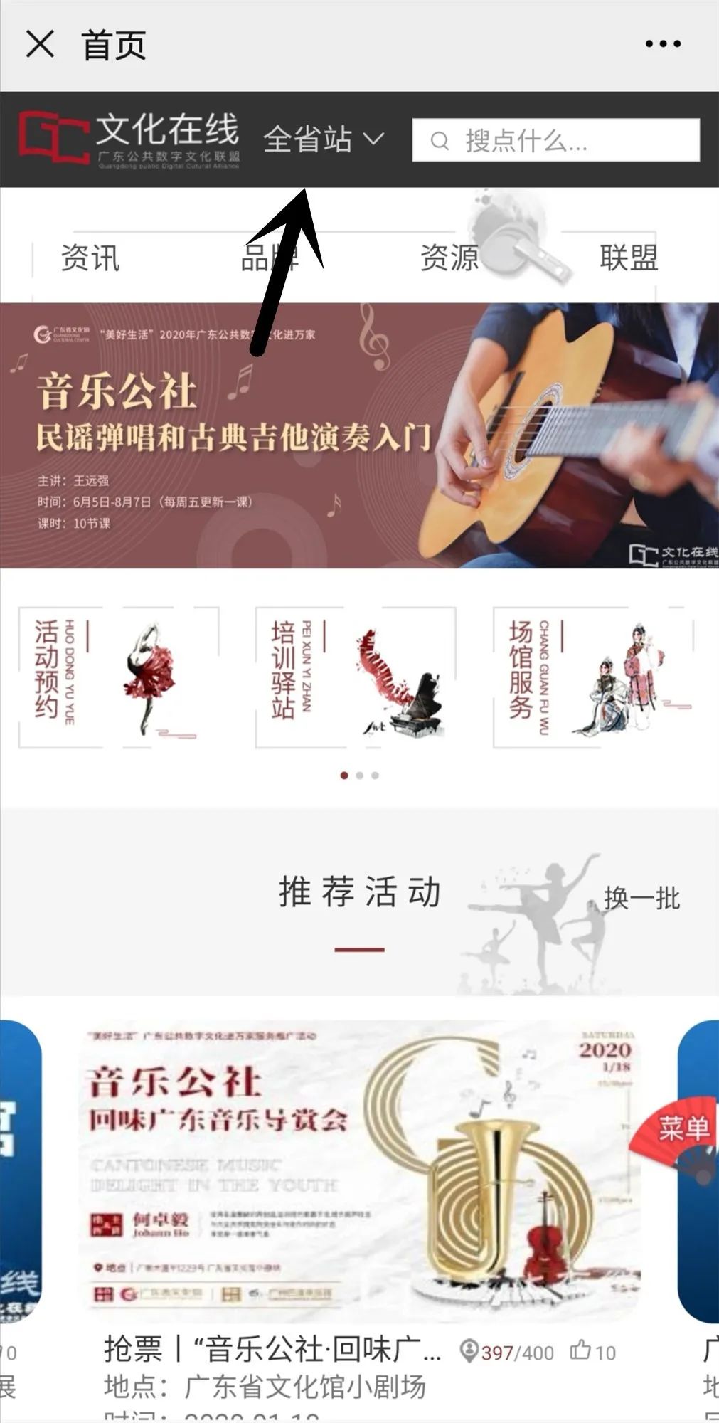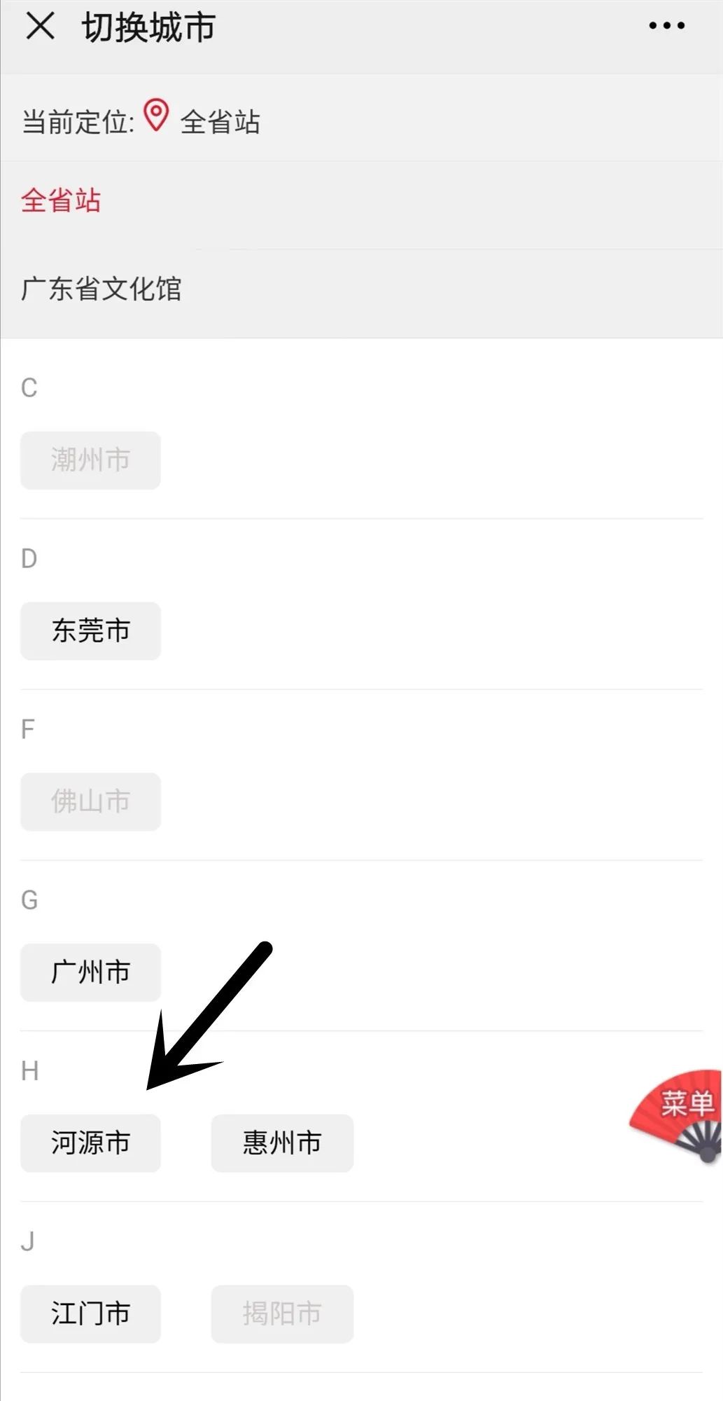 3、點擊頁面上方全省站切換成河源市,再點擊左上方河源市文化館