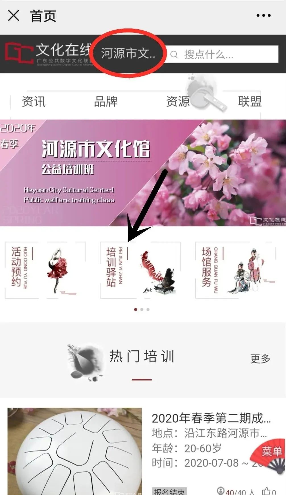 4、切換河源市文化館后回到首頁,點擊培訓驛站