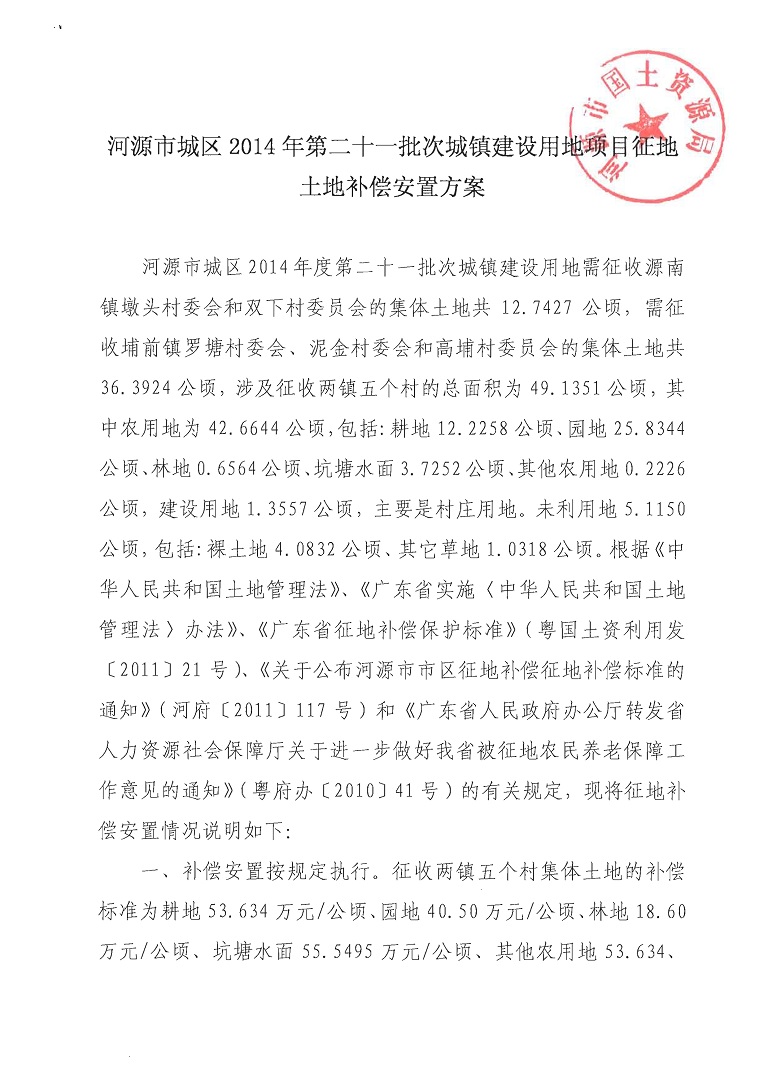河源市城區2014年第二十一批次城鎮建設用地項目征地土地補償安置方案