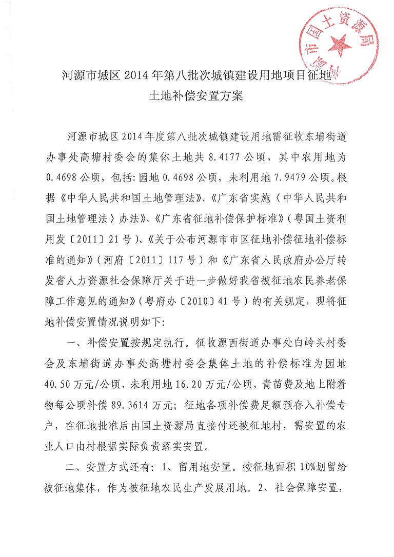 河源市城區(qū)2014年第八批次城鎮(zhèn)建設(shè)用地項(xiàng)目征地土地補(bǔ)償安置方案