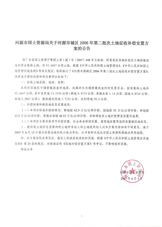 河源市國土資源局關(guān)于河源市城區(qū)2006年第二批次土地征收補(bǔ)償安置方案的公告
