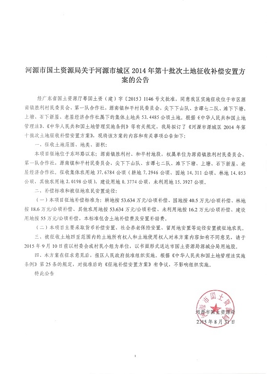 河源市國土資源局關于河源市城區2014年第十批次土地征收補償安置方案的公告