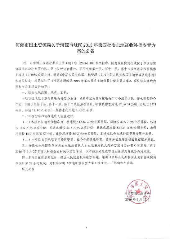 河源市國土資源局關(guān)于河源市城區(qū)2015年第四批次土地征收補(bǔ)償安置方案的公告