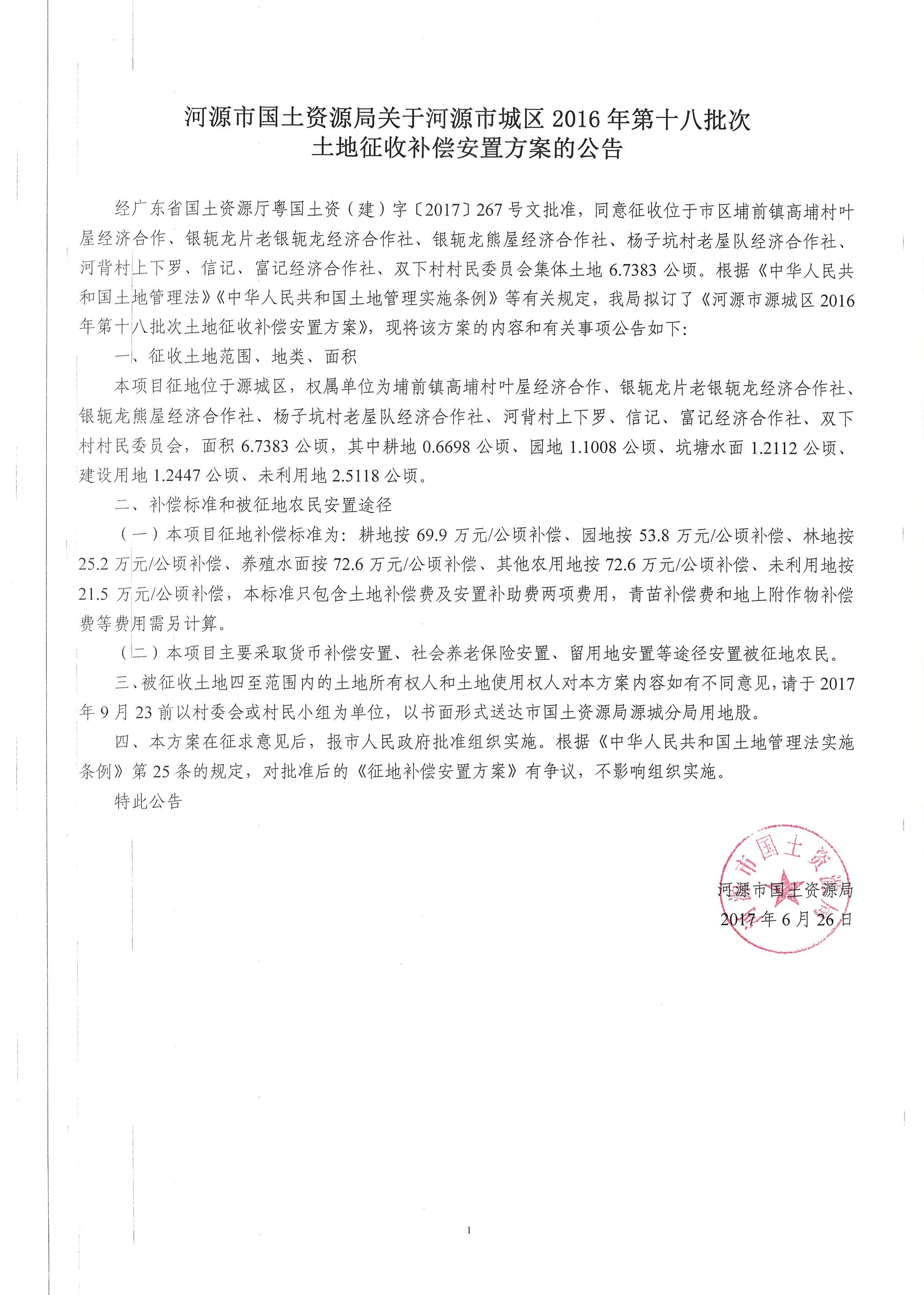 河源市國土資源局關于河源市城區2016年第十八批次土地征收補償安置的公告
